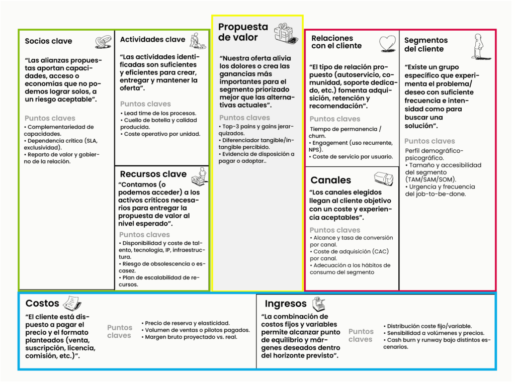 Cada sección del Modelo de Negocio Canvas representa una suposición que puede contrastarse con datos reales: desde entrevistas con usuarios hasta pruebas de precio. Validar a pequeña escala reduce el riesgo de desarrollar productos o servicios que el mercado no demande.